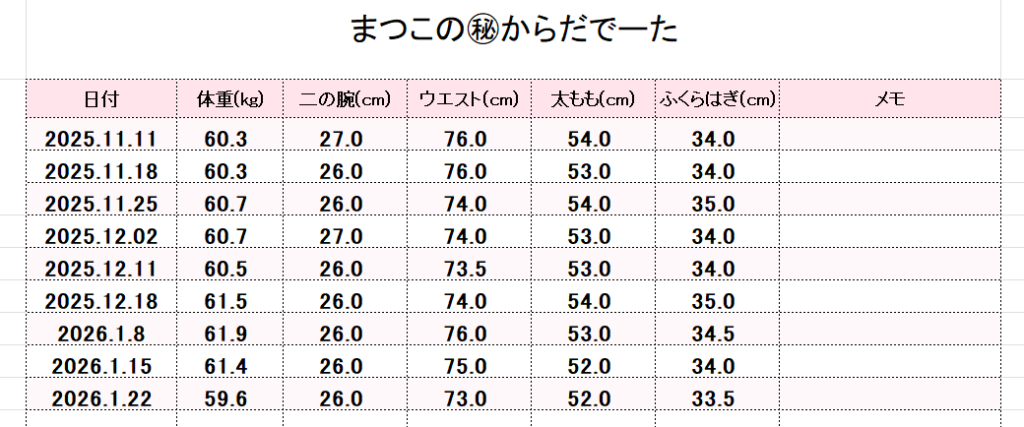 体重推移とサイズ記録。数字で見る今週の結果